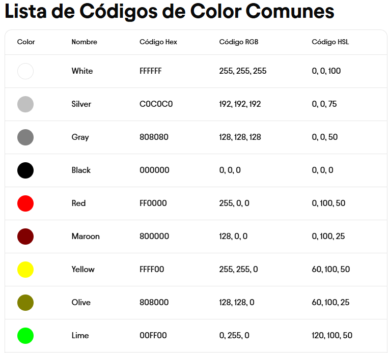 Los colores que aparecen en una página web se pueden establecer mediante los sistemas de codificación de color Hexadecimal, RGB o HSL. Son especificados como valores numéricos, aunque hay algunos colores que pueden ser nombrados por sus nombres en inglés.
